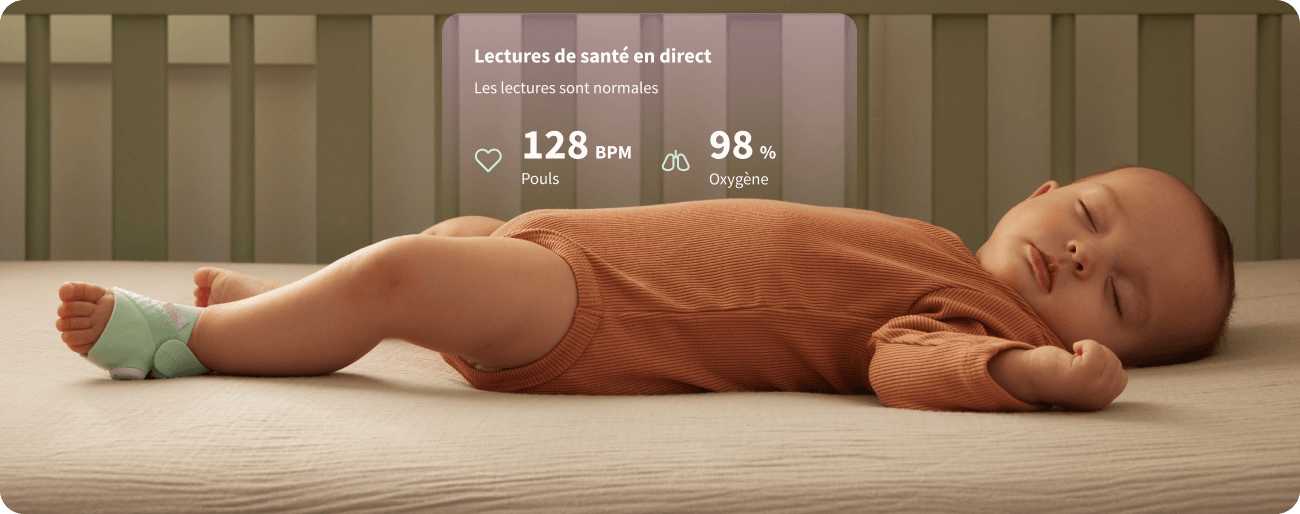 Si les résultats de santé de votre bébé se situent en dehors des plages prédéfinies, des lumières et des sons sur la station de base ainsi que des notifications vous en avertiront en temps réel.