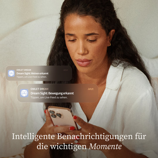 Die Dream Sight erkennt zuverlässig Weinen, Geräusche und Bewegungen und informiert dich sofort über die Owlet Dream App. Die präzise Alarmtechnologie filtert Hintergrundgeräusche und vermeidet unnötige Störungen, sodass du genau dann reagieren kannst, wenn dein Baby dich braucht. So bleibst du jederzeit handlungsfähig – beim Kochen, Arbeiten oder einfach beim Entspannen.